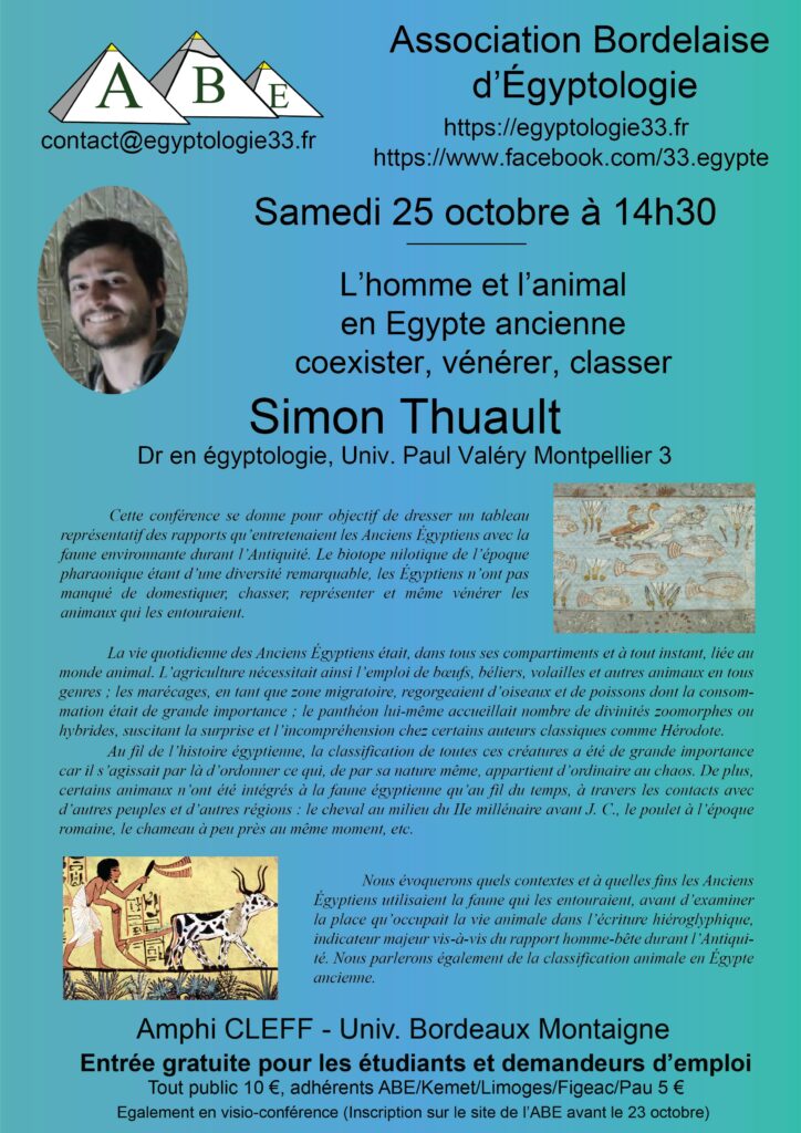 Cette conférence se donne pour objectif de dresser un tableau représentatif des rapports qu’entretenaient les Anciens Égyptiens avec la faune environnante durant l’Antiquité. Le biotope nilotique de l’époque pharaonique étant d’une diversité remarquable, les Égyptiens n’ont pas manqué de domestiquer, chasser, représenter et même vénérer les animaux qui les entouraient.