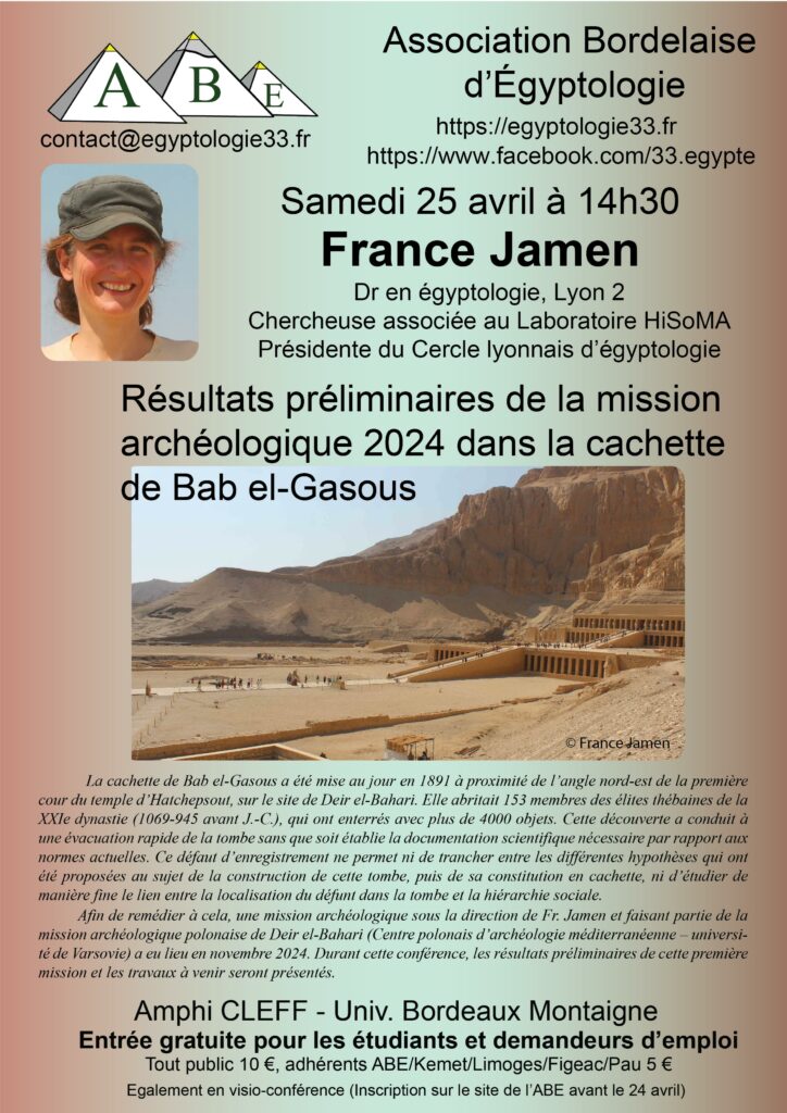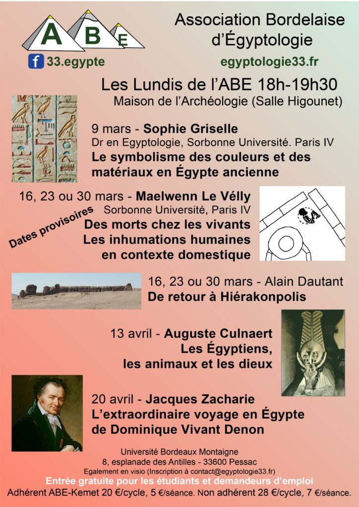La session de printemps du cycle de conférences des Lundis de l’ABE (n° 7) se tiendra les 17, 24 et 31 mars et les 7 et 14 avril de 18h00 à 19h30 dans la salle Higounet de la maison de l’archéologie. Cette activité est ouverte au public. Une participation est demandée (adhérent ABE-Kemet-Limoges-Figeac-Pau: 20 €/cycle ou 5 €/séance; non adhérent : 28 €/cycle ou 7 €/séance). Les cycles sont gratuits pour les étudiants et les demandeurs d’emploi. Le cycle peut également être suivien entier ou à la séance en visio-conférence sur inscription préalable ci-dessous.